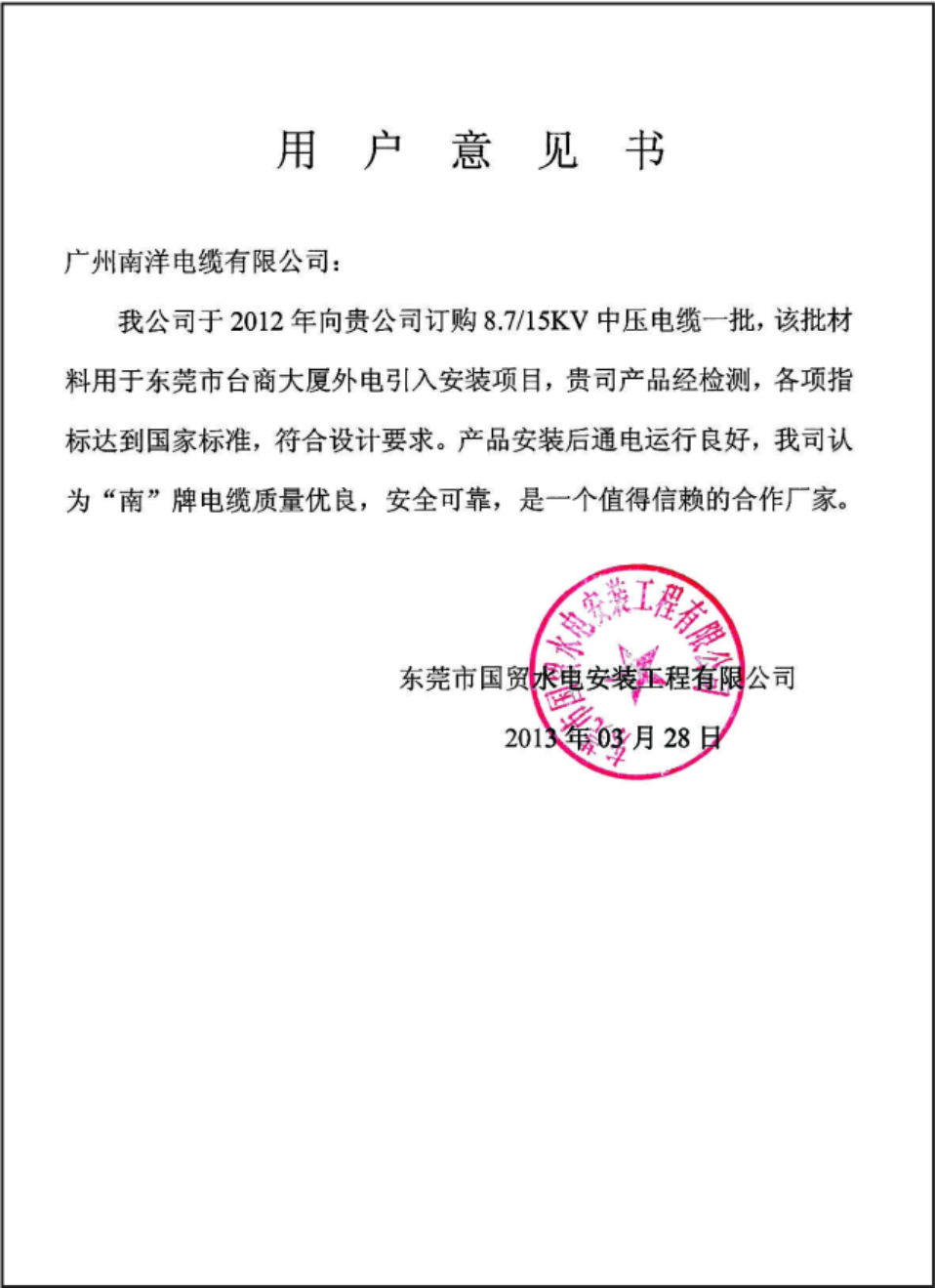 廣州南方電力集團北區(qū)建設(shè)有限公司用戶意見書